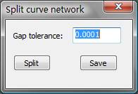 4、启动命令 _RsSplitCurveNetwork. 选择以上所生成的所有曲线,将相交点缝隙值设置为 0.0001, 按下 Split 按钮, 曲线将在相交点处被打断。此时真正拓扑意义的四边形区域分块已经形成,