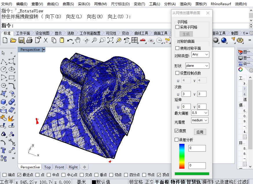 4、Rhino 命令提示行显示 ‘Select a mesh to create a nurbs surface' . 左击鼠标选择显示的网格模型,然后再右击鼠标,你会看到弹出一个名叫 Single surface from mesh 的对话框。