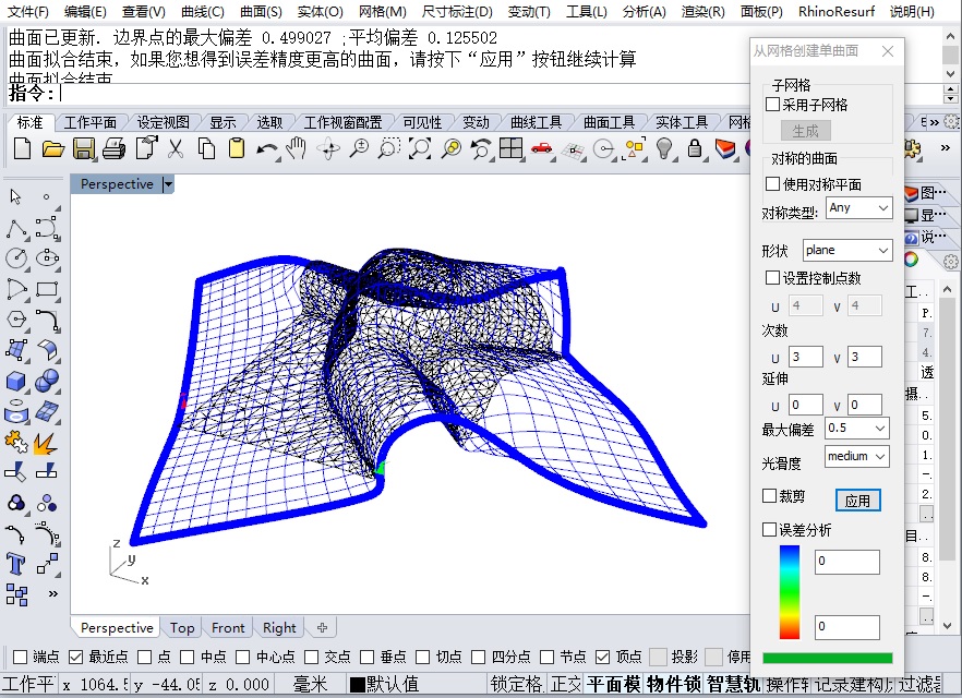 5、点击 Single surface from mesh 对话框中的 Apply 按扭,程序将会执行曲面生成操作,片刻后将出现所生成的曲面。提示出现的 max deviation=0.499050. average deviation=0.125502 是指所选网格面与所生成的曲面间的最大与平均偏差。