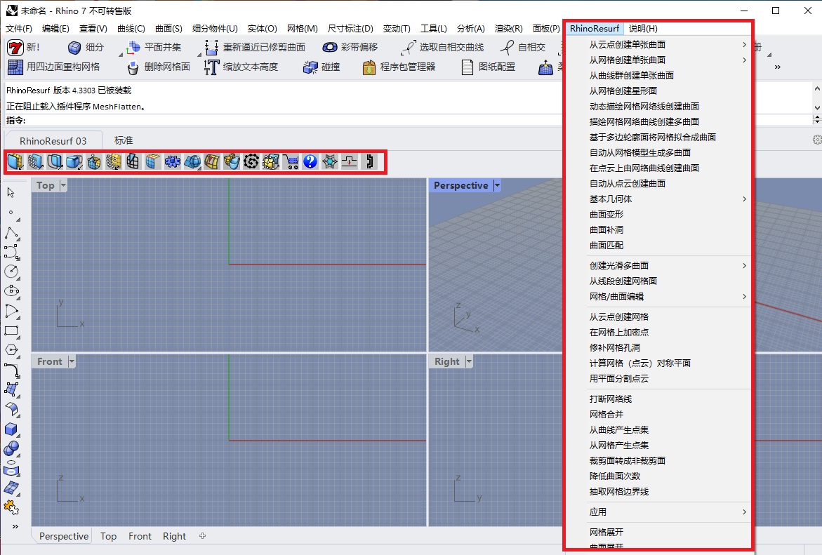 第一次手工装载成功后, 以后每次启动Rhino ,都会自动装载RhinoResurf插件。以下是成功装载RhinoResurf后Rhino界面, 你可以看到红色方框里是RhinoResurf工具条和菜单。