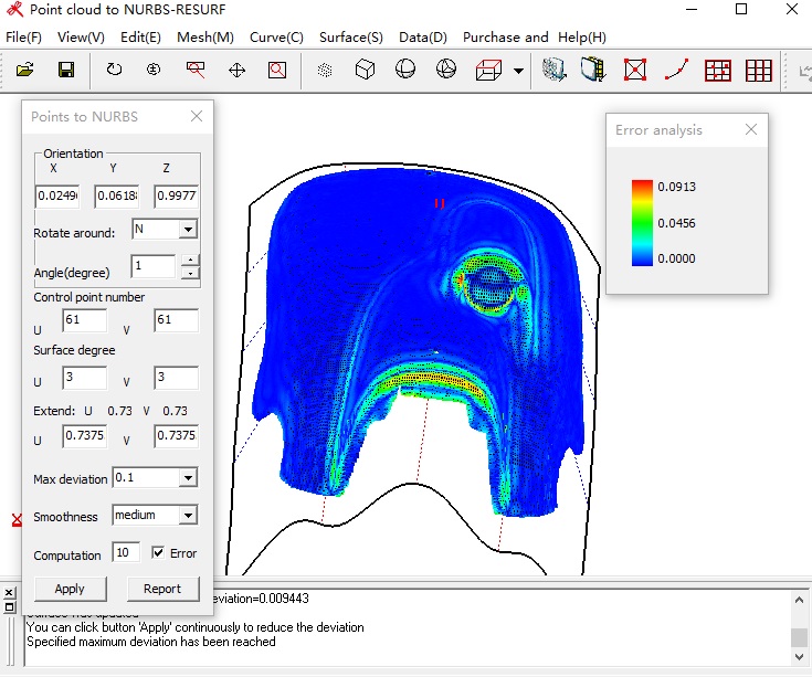 1、从云点数据的基础上重构出一张自由曲面,用户可调节重构的精度和曲面光滑度。可处理数万个点以上的大规模mesh数据。