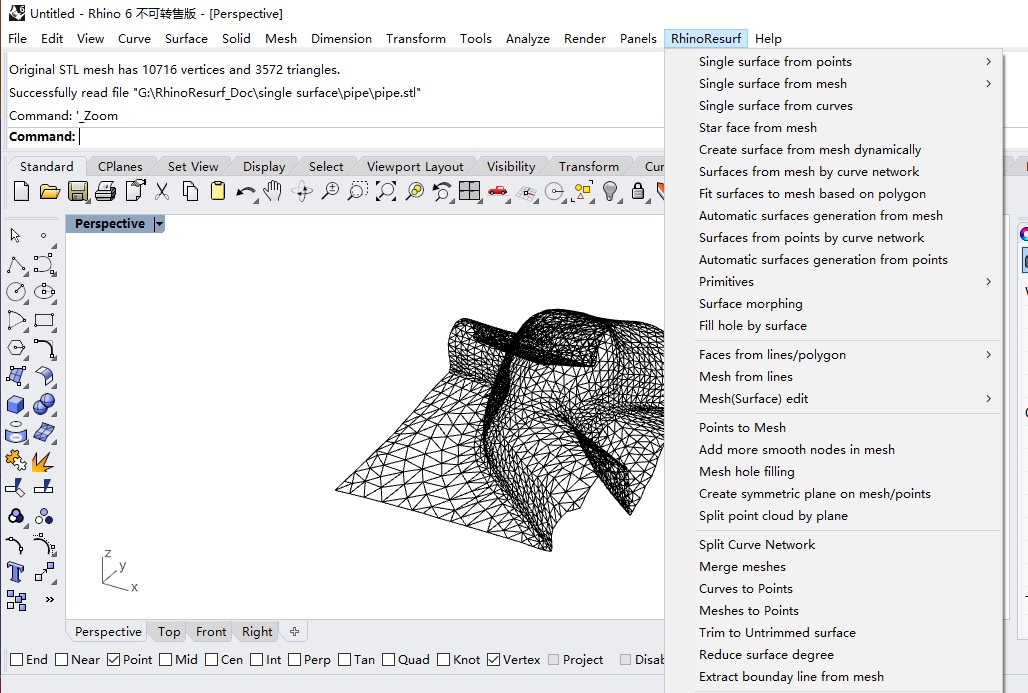 3、调整 Rhino 的视图区 (View->Zoom->Extents). 你将会看到由先前一步所导入的网格文件 pipe.stl 所显示的模型。在子菜单 RhinoResurf 上选择项目 Single surface->对话框, 或者直接在 Rhino 命令提示行里输入命令名字 RsMesh2Surf 。