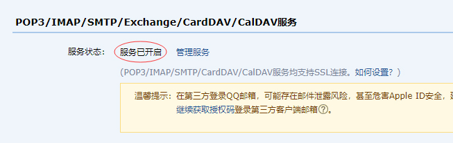 4、以qq邮箱为例,如果需要使用第三方邮件客户端,需要开启POP3/IMAP/SMTP/Exchange/CardDAV/CalDAV服务,这里会获得授权码,复制下来,后面用会到。(进入qq邮箱后,点击左上角设置--账号--pop3...服务)