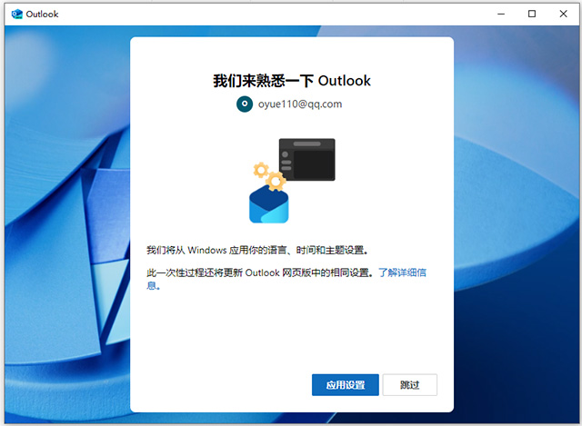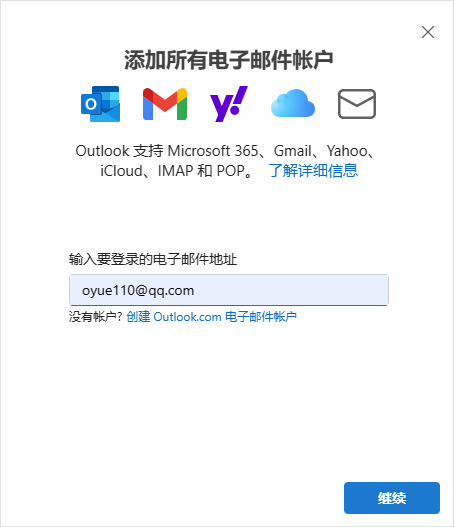 1、下载安装好outlook邮箱电脑版,首次使用,添加你的电子邮件地址,这里以qq邮箱为例;