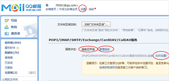 3、详细的方法:打开web登陆qq邮箱,找到设置,去开启POP3/IMAP/SMTP/Exchange/CardDAV/CalDAV服务;