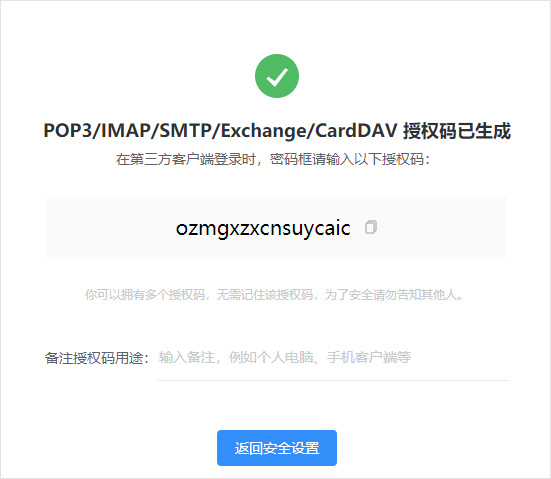 5、邮箱的设置:可以选择pop或imap任意一种方式,第三方客户端需要输入授权码进行验证。