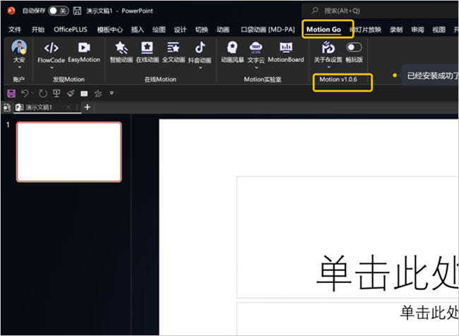 安装结束后,即可点击“立即打开”就会启动PPT程序,然后你在顶部选项卡就可以看到“MotionGo”了。