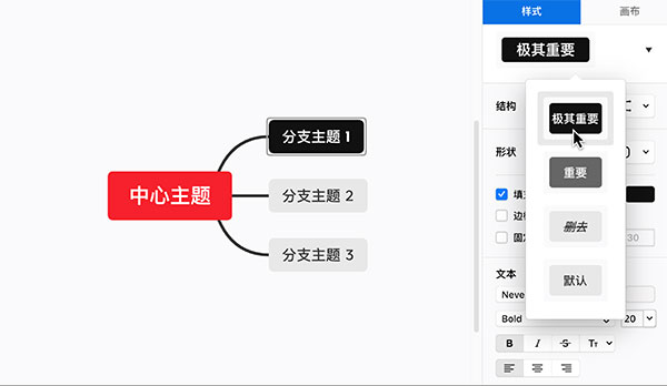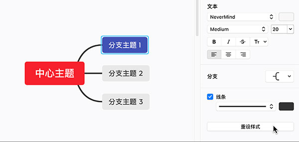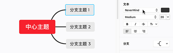 XMind 支持修改主题的文本字体、颜色、大小、粗细、对其方式等。选中主题,在样式的文本中即可更改。