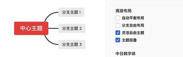 注:如果不想自由主题和分支主题进行粘连,可以点击画布空白处,在格式菜单栏画布中,勾选高级布局中的灵活自由主题和主题层叠。