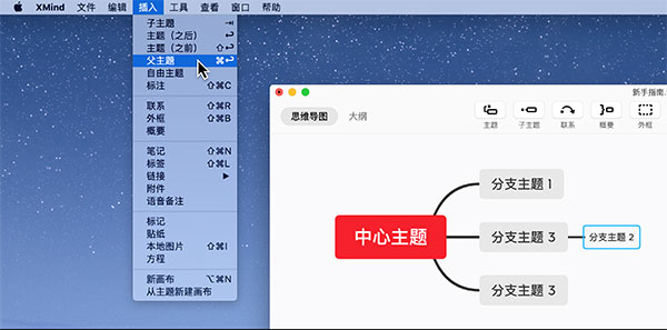 选中主题,在菜单栏的插入中,点击父主题进行添加。