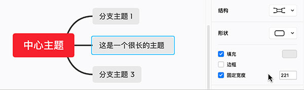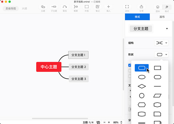XMind 为主题提供多种形状。选中主题,在右侧格式菜单栏中的形状中可以进行更改。