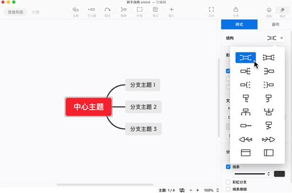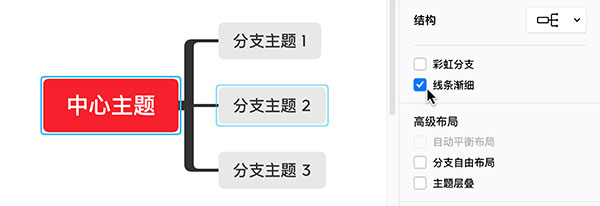 XMind 为主题分支提供了多种样式分支形状、线条粗细、彩虹分支、线条渐细等,选中主题,在主题样式的分支样式中即可更改。