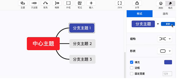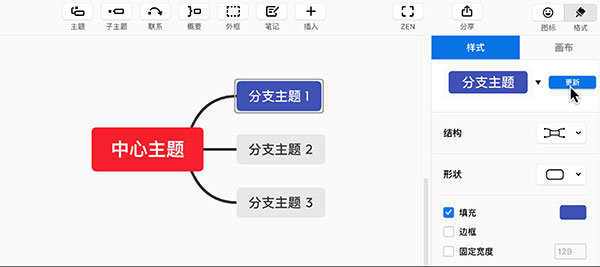 更改完一个主题的样式后,点击 格式>样式>更新,即可一键同步修改所有同级别的分支主题样式。