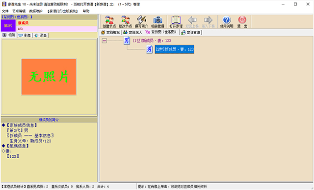 家谱先生是国产的一款具有很高实用价值的专业家谱制作软件。集管理大族谱、多族谱等复杂族谱,图文并茂,可以内置成员相册、视频以及录音等多种功能为一体,支持族谱打印功能,操作简单而便捷,特点明显,使用起来十分高效,更加人性化,非常实用,无论您是新修、续修、还是改修老式家谱、或者是抢救复制私藏老谱,家谱先生都将成为您管理家谱资料的强有力工具,有需求的用户请下载体验!