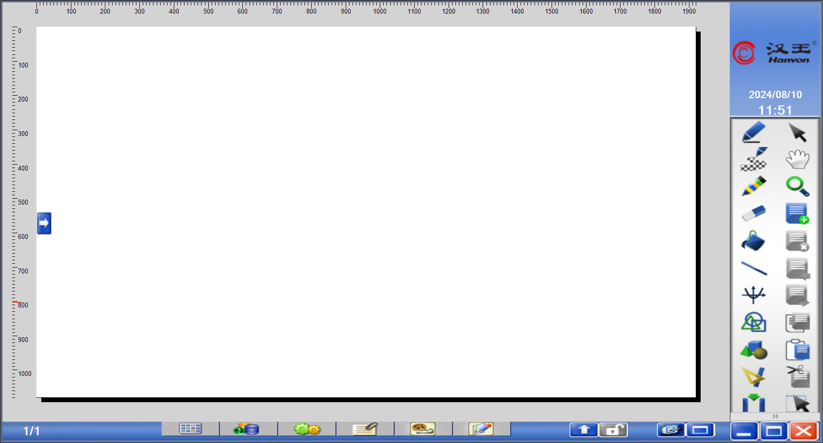 软件主界面分为五个区域:白板编辑区、主工具栏、子工具栏、时间日期显示区、页码显示区、坐标显示区;
