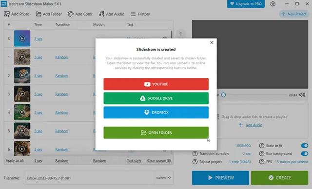 4、当图片幻灯片准备好后,你可以在你可以通过点击 "打开文件夹" 按钮。在此之后,您可以退出应用程序或继续进行其他幻灯片项目。