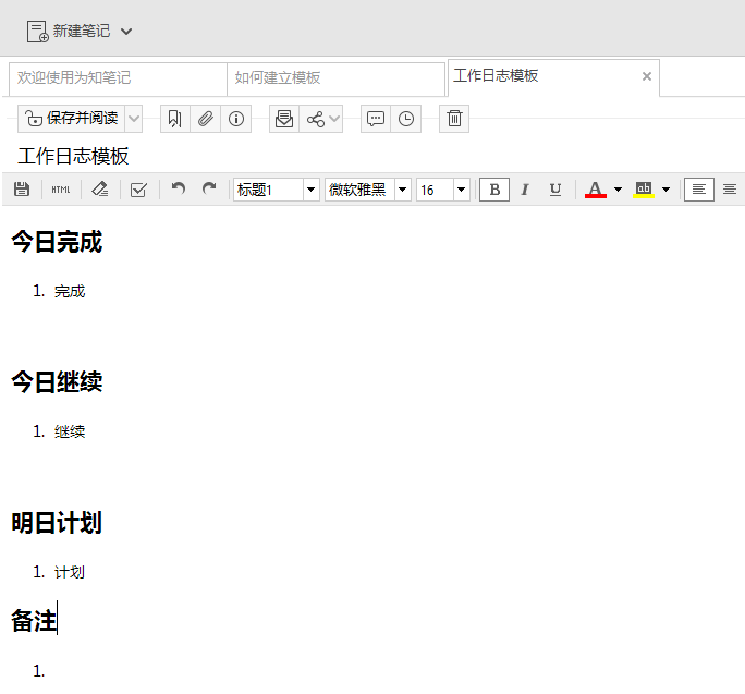 1、首先,您需要打开为知笔记,建立一个新的笔记,然后按照需要的格式进行编辑。例如建立一个工作日志的模板: