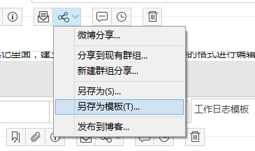 2、按您的需求,编辑好工作日志笔记后保存笔记,然后点击笔记阅读区域工具栏上的分享按钮,并选择菜单:另存为模板,