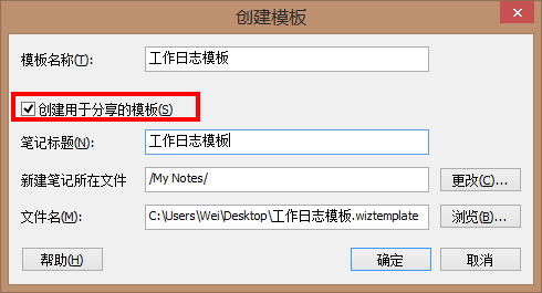 1、如果您想创建一个可以进行分享的模板,例如您创建模板后,可以将这个模板发布在为知笔记用户论坛上面,或者分享给您的同事,则可以使用这个功能。 首先,在之前创建模板对话框里,选择”创建用于分享的模板“,