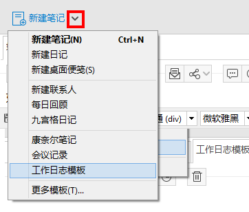 1、打开为知笔记,点击工具栏上面 新建笔记 按钮右边的箭头,在出现的菜单中,就会出现刚才新建的模板名称,点击该名称后,就可以利用这个模板新建笔记了,如下图,