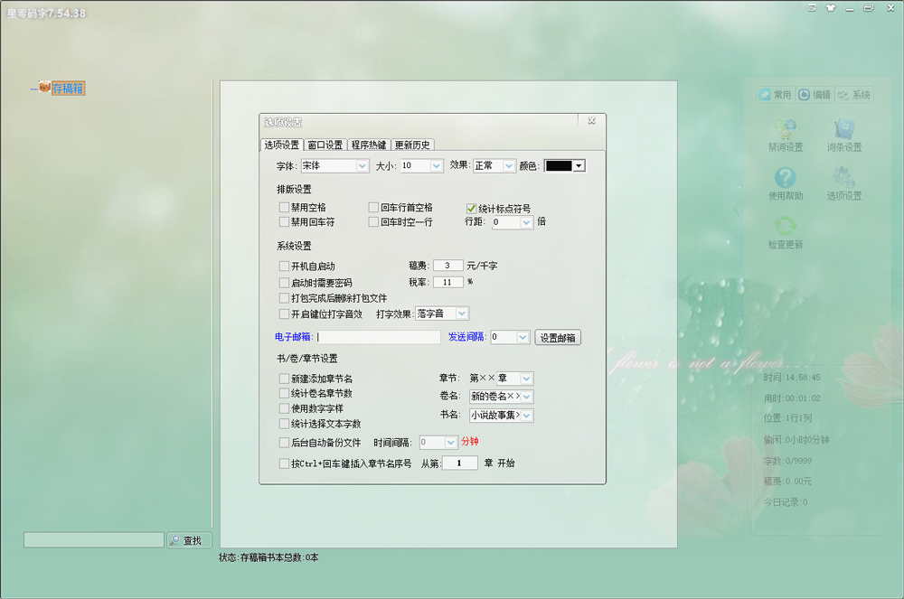 3、统计面板当中有很多信息,剩余字数,剩余时间,是在强制码字状态时才会有作用。其它的一看你就明白了,至于已码字数,这里显示的是纯字数,去掉了标点符号回车符这些因素的干扰。稿费:XXX元,是按千字多少元计算。是在"系统设置"里设置的。