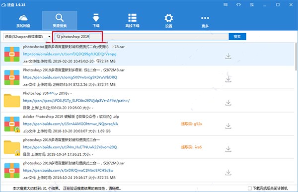 3、选择资源搜索,比如输入photoshop 2019,可以找到各种链接;