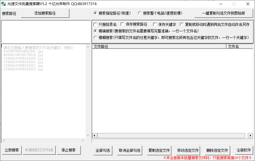 光速文件批量搜索器是一款功能强大的本地文件搜索工具,已经成功破解,用户可以无限制免费使用。软件界面简洁大方,拥有精确和模糊两种搜索方式,能够支持搜索整个电脑和搜索指定路径,速度是系统搜索的10倍以上,绝对给务,快下载收藏吧。