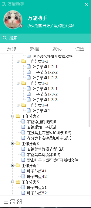 3、请先看教程页里的教程再去操作,只允许在"工作文件"和"网址收藏"两个栏目内增删树枝节点和叶子节点,请不要增加或删除根栏目("系统操作""工作文件""网址收藏""开源扩展""最近用过"),否则有可能造成下次运行加载不了节点树.