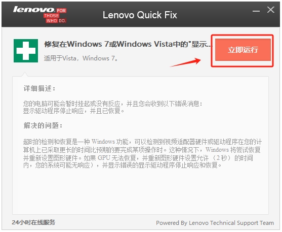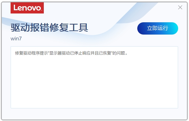 联想电脑在国内的市场还是占有率很高的,在此小编带来了联想驱动报错修复工具,这款软件是专为联想电脑而开发的,能够针对联想电脑出现的驱动问题(win7系统出现“显示器驱动已停止响应并且已恢复”)进行一键修复,快速修复驱动程序提示“显示器驱动已停止响应并且已恢复”的问题,用最简单的方式修复此项错误,您只要打开点击立即运行即可对此故障进行修复,有需要的朋友可千万不要错过。
