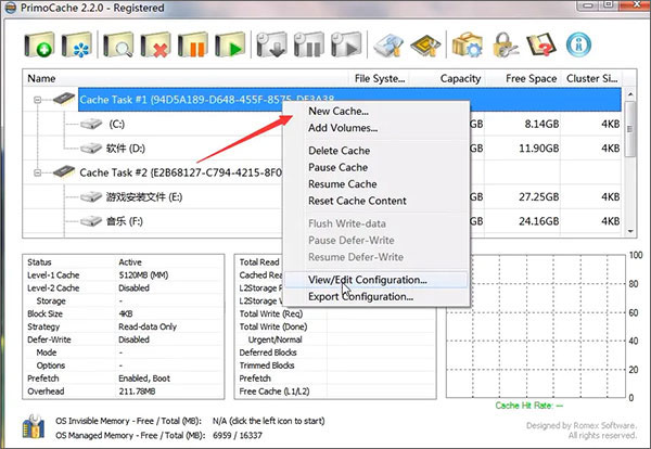 8、PrimoCache完美破解版支持同时缓存多个硬盘和多个分区。