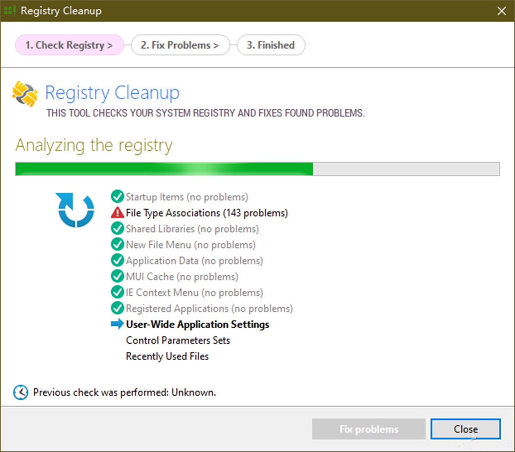 在紧接着弹出的Registry Cleanup窗口中,软件会自动扫描完成注册表检查(Check Registry)过程;接着报告检查出的问题,并确认修复,点击Fix problems按钮进行修复;修复完成后,点击Fished完成整个过程。