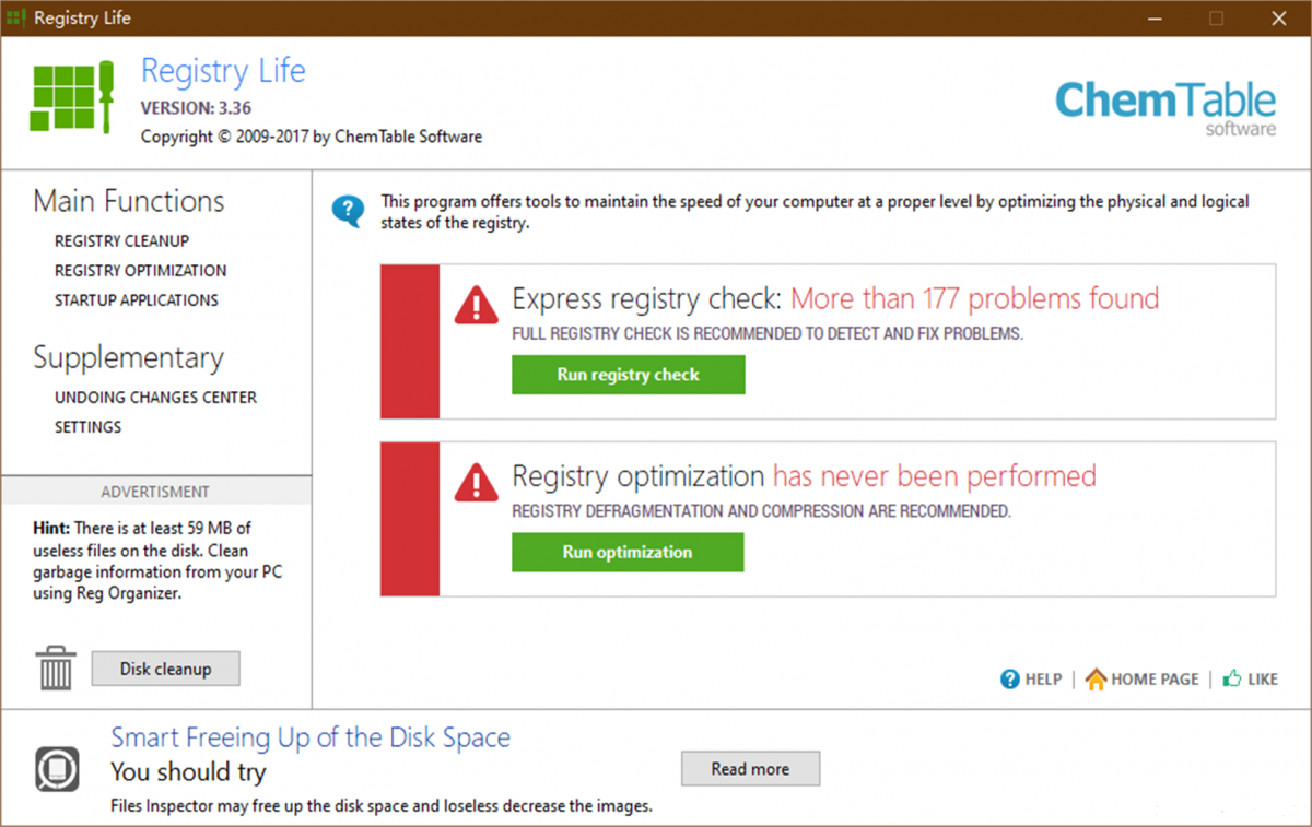 除了修复错误外,对注册表信息进行优化重组和压缩,也能提高系统运行效率。在首次运行软件后,软件会提醒尚未对注册表进行过优化和压缩,这时点击Run optimization执行优化和压缩。我们也可以在软件左侧的Main Functions栏下,点击Registry Optimization选项启动该过程。