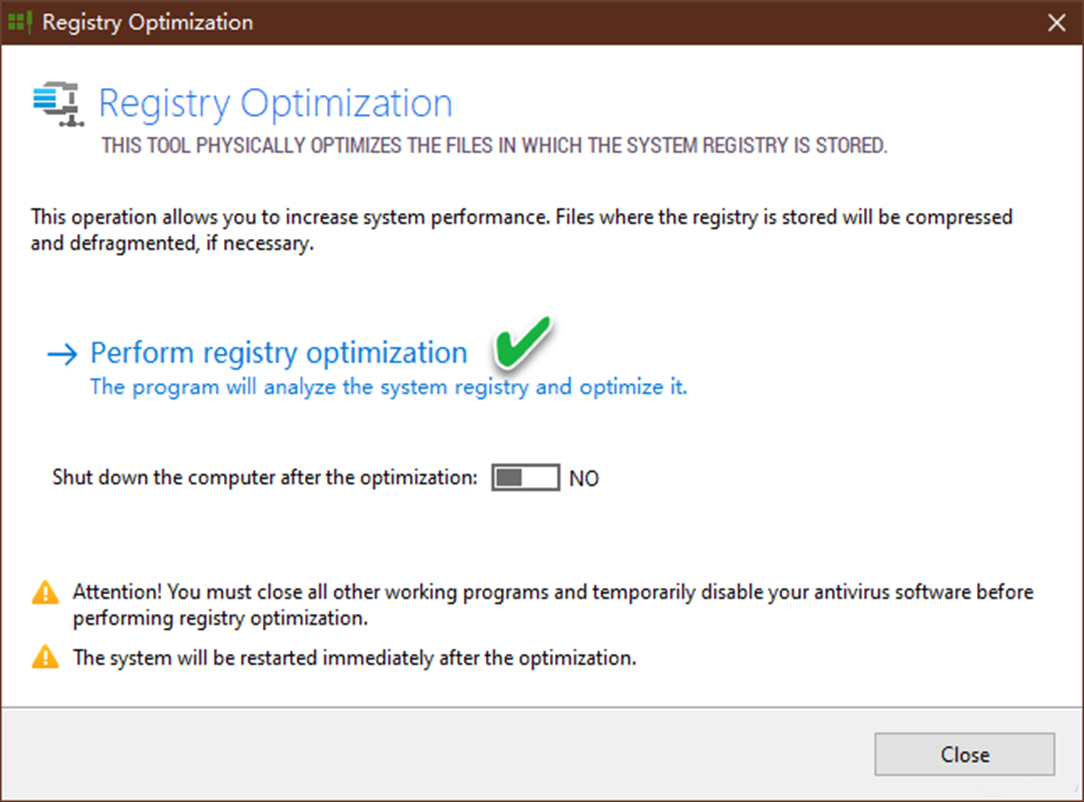 在Registry Optimization窗口中,只需点击Perform Registry optimization按钮,即可自动对注册表进行分析,并执行压缩和优化。根据电脑中安装和使用软件情况的不同,这一过程可能需要的时长也差别很大。如果担心在下班前整理注册表等待太久,可将Shut down the computer after the optimization后的开关拨动到Yes的状态,这样结束后会自动关机。