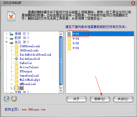 3、在下面列表中选择9-23文件夹,再依次点击【粉碎】