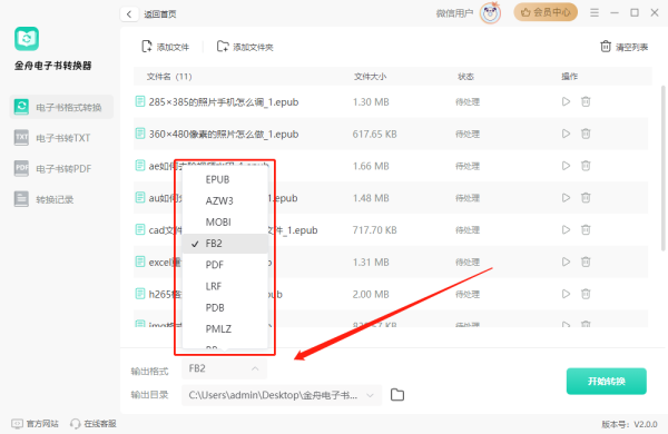 第三步、点击输出格式下拉按钮,选择需要转换成的电子书格式。