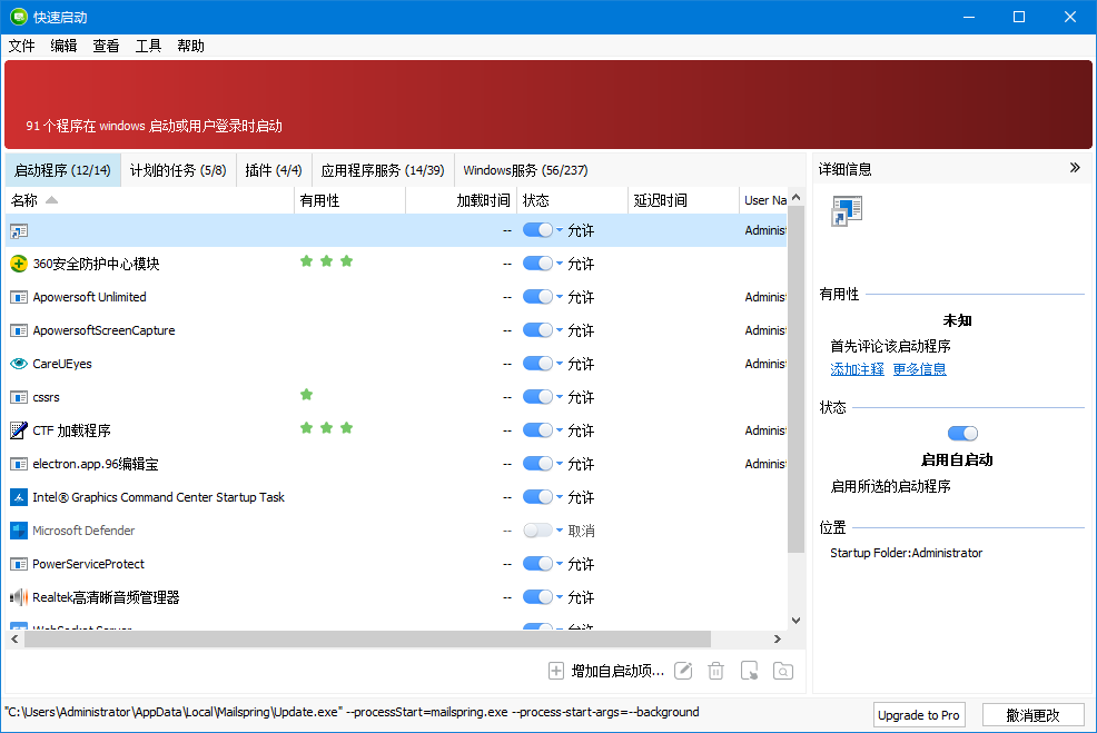 能快速了解应用启动的路径、参数等信息。如果有需要,也可以自己增加开机启动项目等。