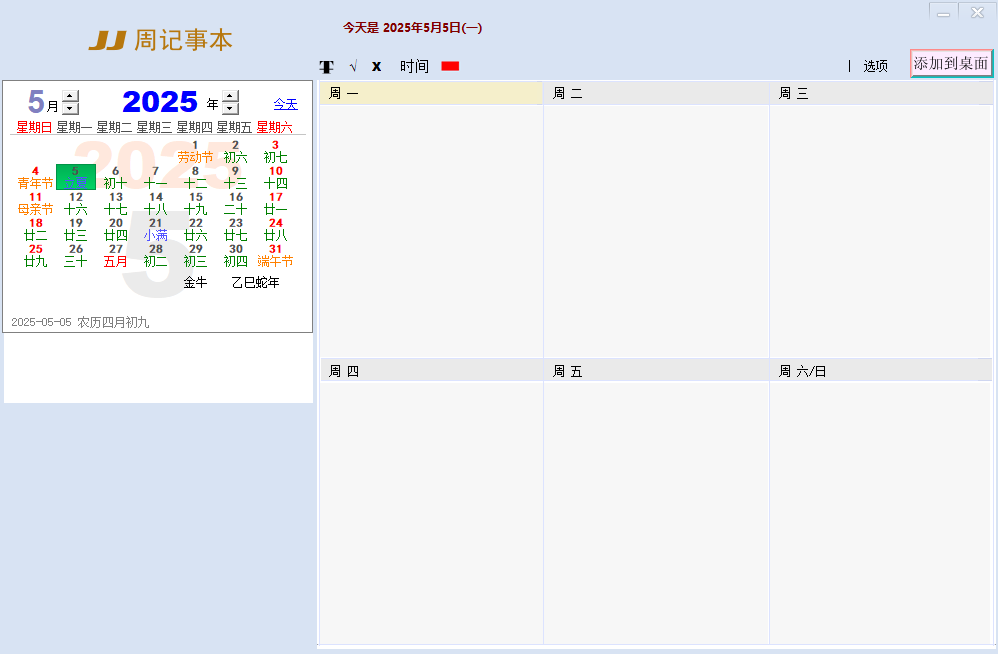 JJ周记事本官方版是由如意吧开发一款非常实用的周记事本软件,您可以提前安排好一周的工作内容,写在记事本上面,省的你因为忙碌而忘记一些重要的事情,也可将周记事添加至桌面上,当然用户可以通过这款周记事本软件方便明了地安排一周事务和工作内容,这样方便随时查看以及对工作内容做及时调整,软件用户界面友好,操作便捷,有需要的朋友可以下载体验。