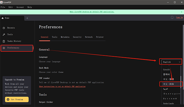初次进入软件默认显示语言为英文,我们打开设置,找到语言设置切换为中文即可,具体如下图所示