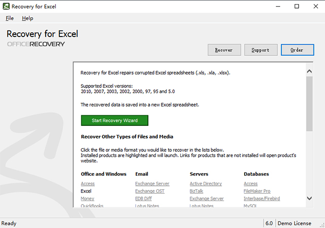 2、支持(xls,XLA,XLSX)修复。支持2010, 2007, 2003, 2002, 2000, 97, 95 and 5.0Excel版本