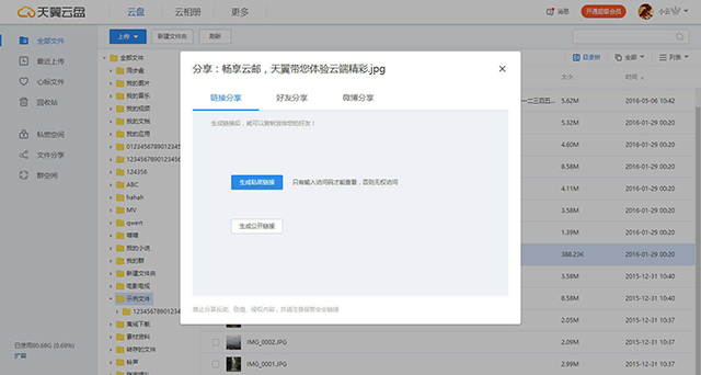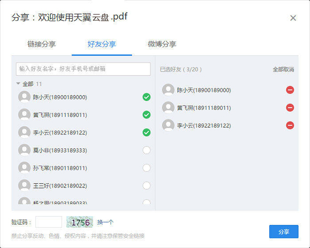 用户可以将天翼云盘中的文件通过链接、微博等方式分享给好友,实现与单个或多个好友分享。