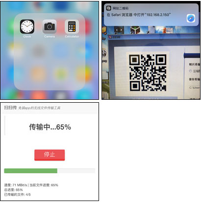 扫扫传操作非常简单,您只需要用您的iOS相机或者微信/QQ等能扫二维码的App扫一扫程序界面显示的二维码,就可以立刻开始传输文件到电脑了。文件传输,就用扫扫传,有需求的朋友请下载体验!