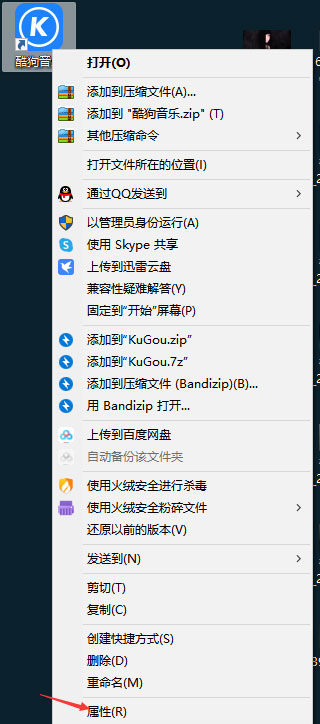 这里以酷狗为例,首先我们找到我们桌面的酷gou桌面菜单,然后单击鼠标右键,然后选择箭头处的属性;