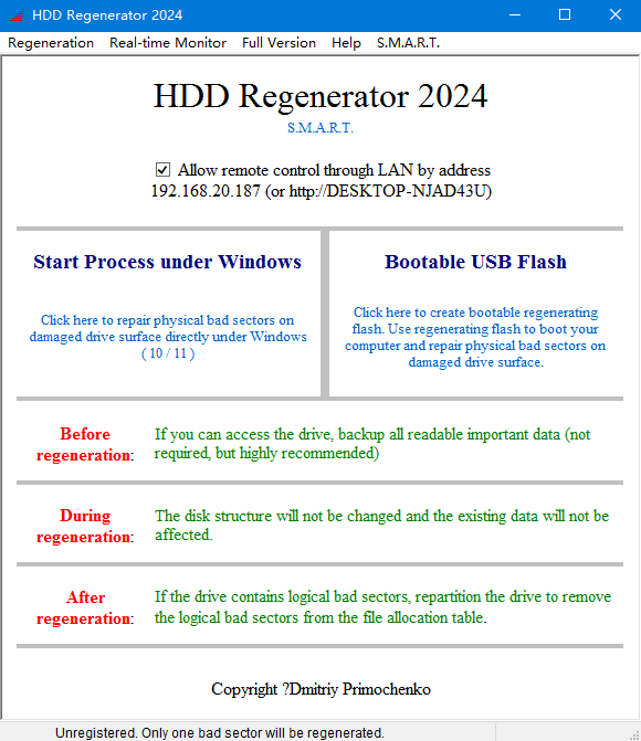 HDD Regenerator 2024 是一款非常实用的硬盘修复工具,专门解决硬盘物理坏道问题。和其他工具不同,它不是简单地隐藏或屏蔽坏道,而是真正修复这些损坏区域,恢复硬盘健康。操作起来也很方便,即使没有专业知识也能轻松上手,软件会一步步引导你完成修复过程。