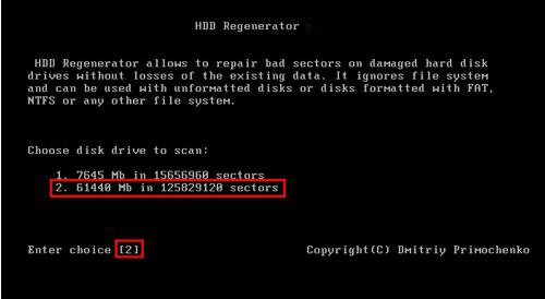 2、之后HDD Regenerator Shell会自动检测到电脑上已安装的所有硬盘,用户需要在其中选择需要修复的硬盘,硬盘会按照序号标识在列表中,在下方输入对应的序号后,点击回车键确认。