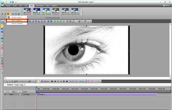 ②如果它是必要的,应用自动裁剪。相应的按钮在工具栏上。这个选项可以帮助你摆脱黑条的图像或视频,使对象符合现场。