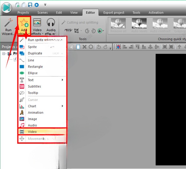 去做,去“编辑器”选项卡上,单击“添加对象”按钮并选择“视频”或“图像”选项的下拉菜单。