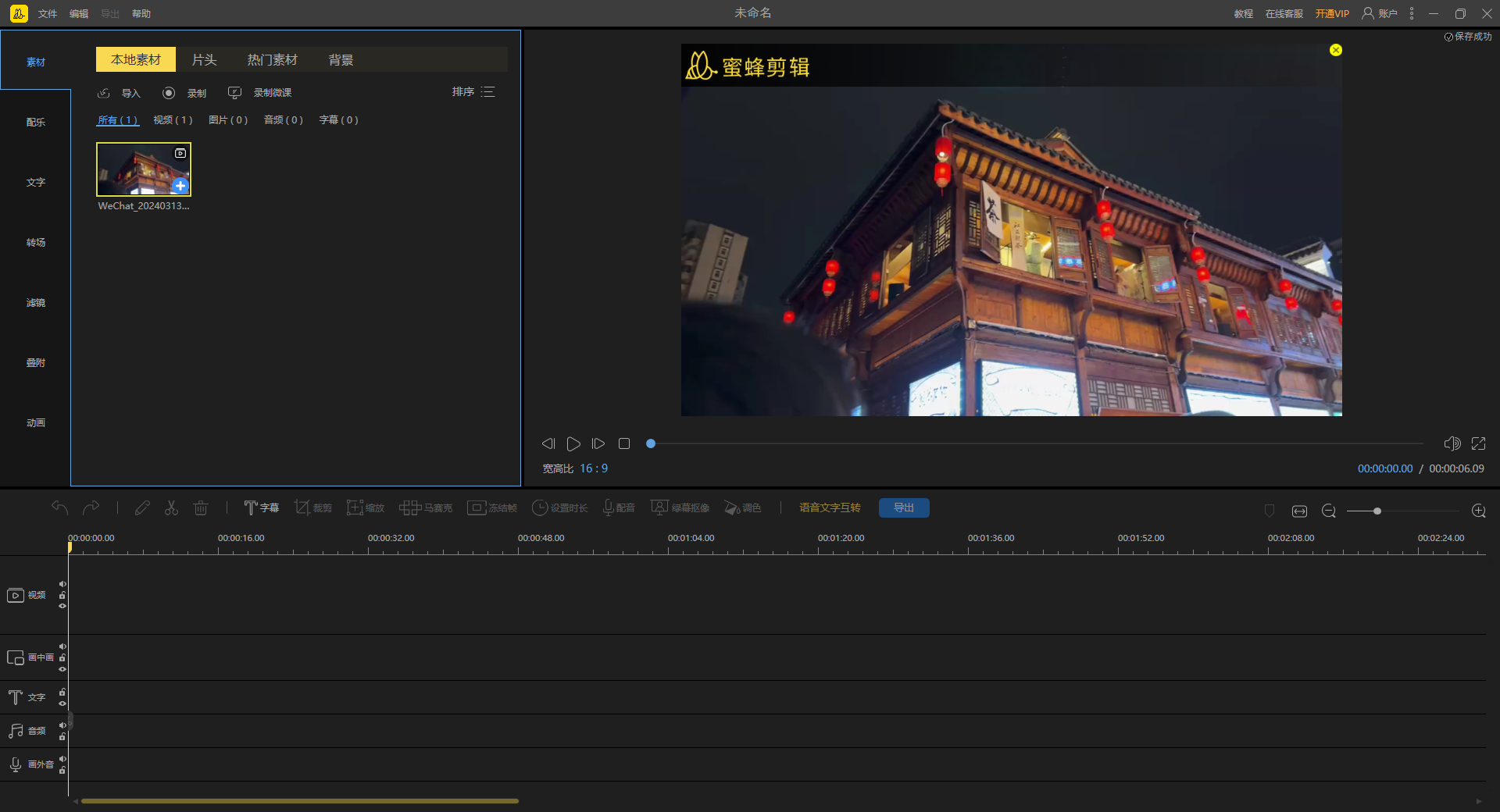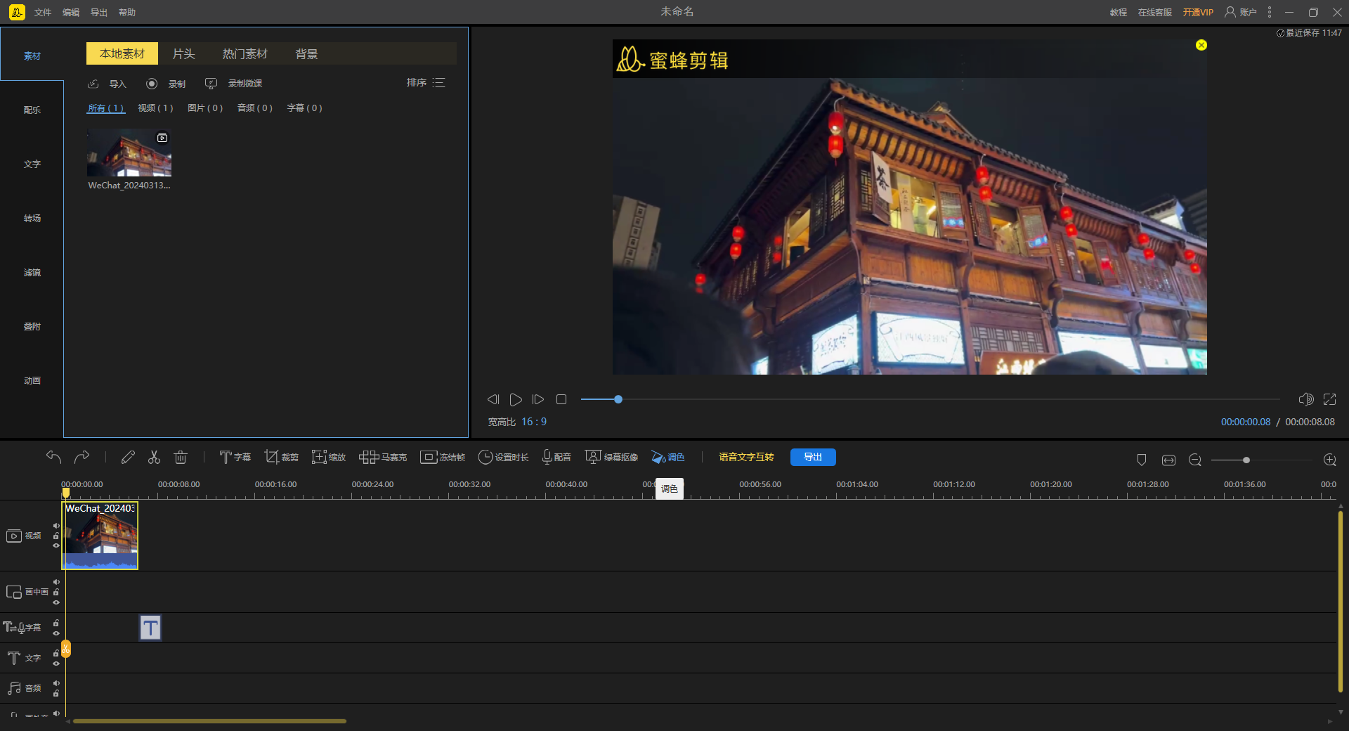 要是你想在这一帧视频里再添加一些图片或是画中画效果,蜜蜂剪辑的多轨道编辑就可以帮到你!在原视频轨道的基础上自动多开一条轨道,可以将素材拖进并进行编辑处理,使视频层次更丰富!而且可以同时编辑字幕和背景音乐的素材,即时观看视频整体效果。