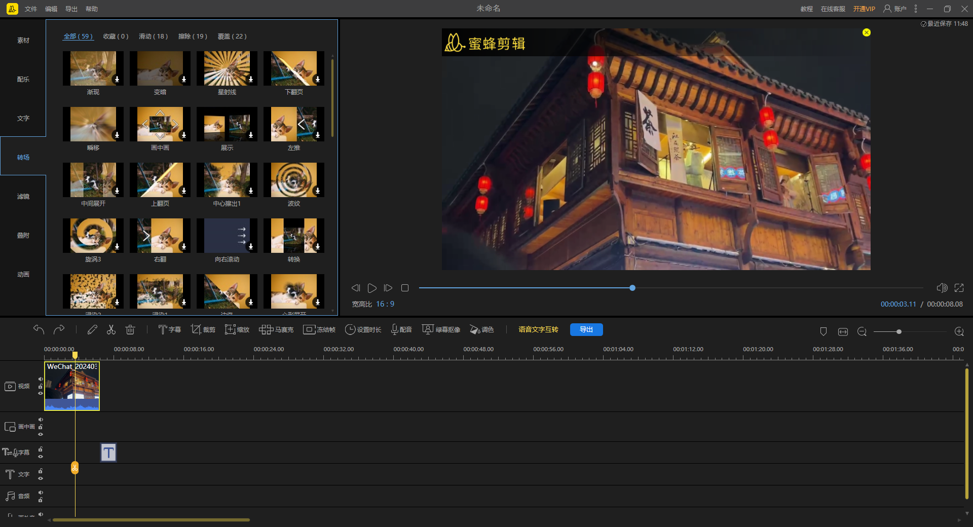 4、如果想要营造更强的视觉感的话,我们可以在转场特效中选择相应的效果,