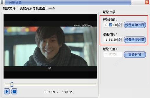 2、可以直接修改开始时间和结束时间,也可以播放预览到需要截取的部分,点击“设置开始时间”按钮来读取当前预览时间作为开始时间。