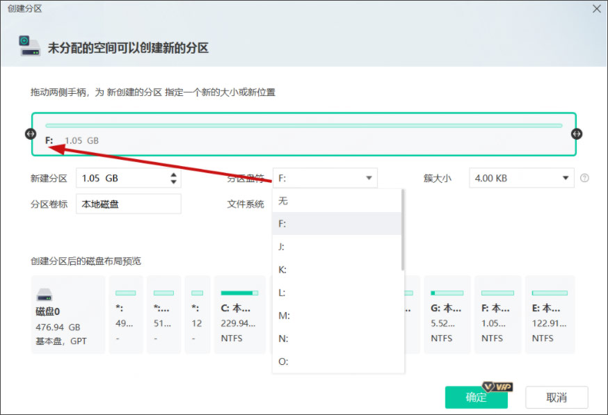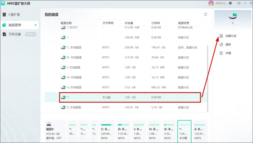 创建分区:选中未分配的盘,点击右侧的创建分区,給这个分区分配一个盘符,然后按步骤操作就可以啦